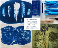 In deze workshop leer je hoe je met UV licht botanische blauwdrukken maakt. We werken met geprepareerd de website planten, negatieven of andere voorwerpen en creëer je eigen unieke cyaanblauwe de website begeleiding van kunstenaar Jacolien de Jong ga je naar huis met een serie blauwdrukken, inclusief één op textiel. Na deze dag heb je alle kennis en inspiratie om zelf thuis verder te gaan. De workshop vindt plaats in haar atelier in Utrecht (Vechtoever, Zuilen). De kosten zijn €99,- per persoon, inclusief materiaal.